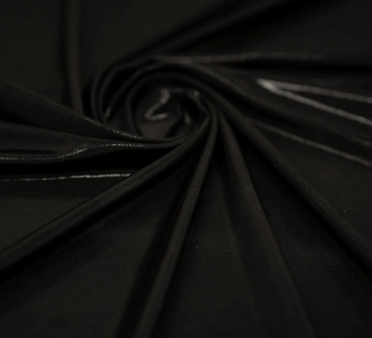 Features black shiny titanium nylon/spandex with shiny red fractal foil spandex