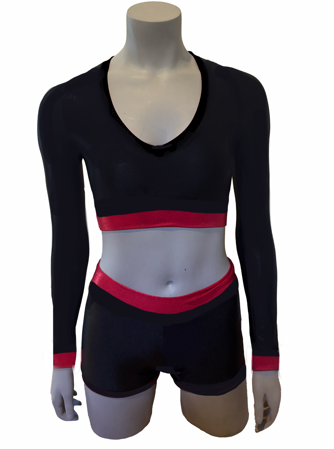 Single layer V neck long sleeve top with 1 1/4” red cuff and red chest band 1 1/4”